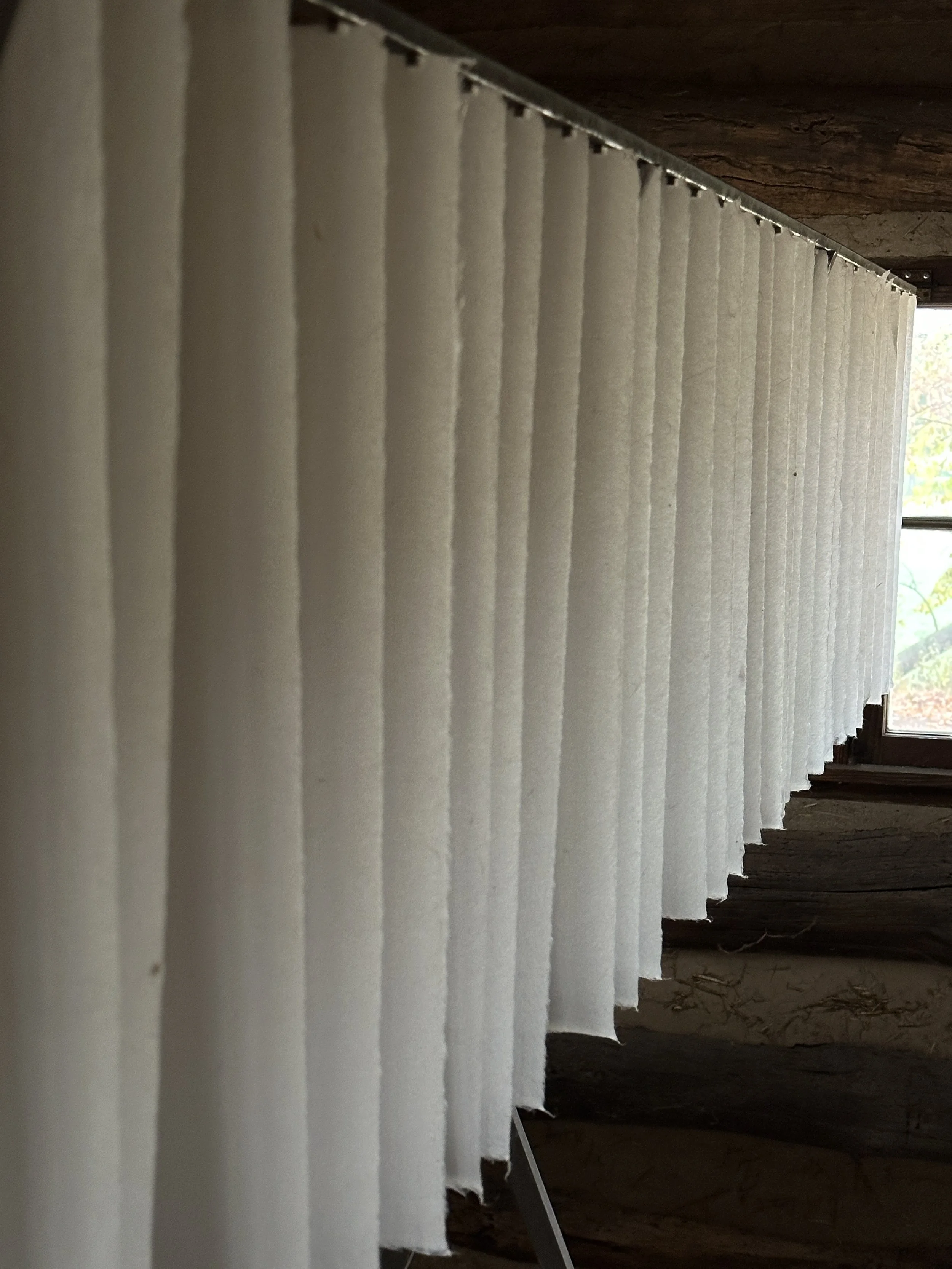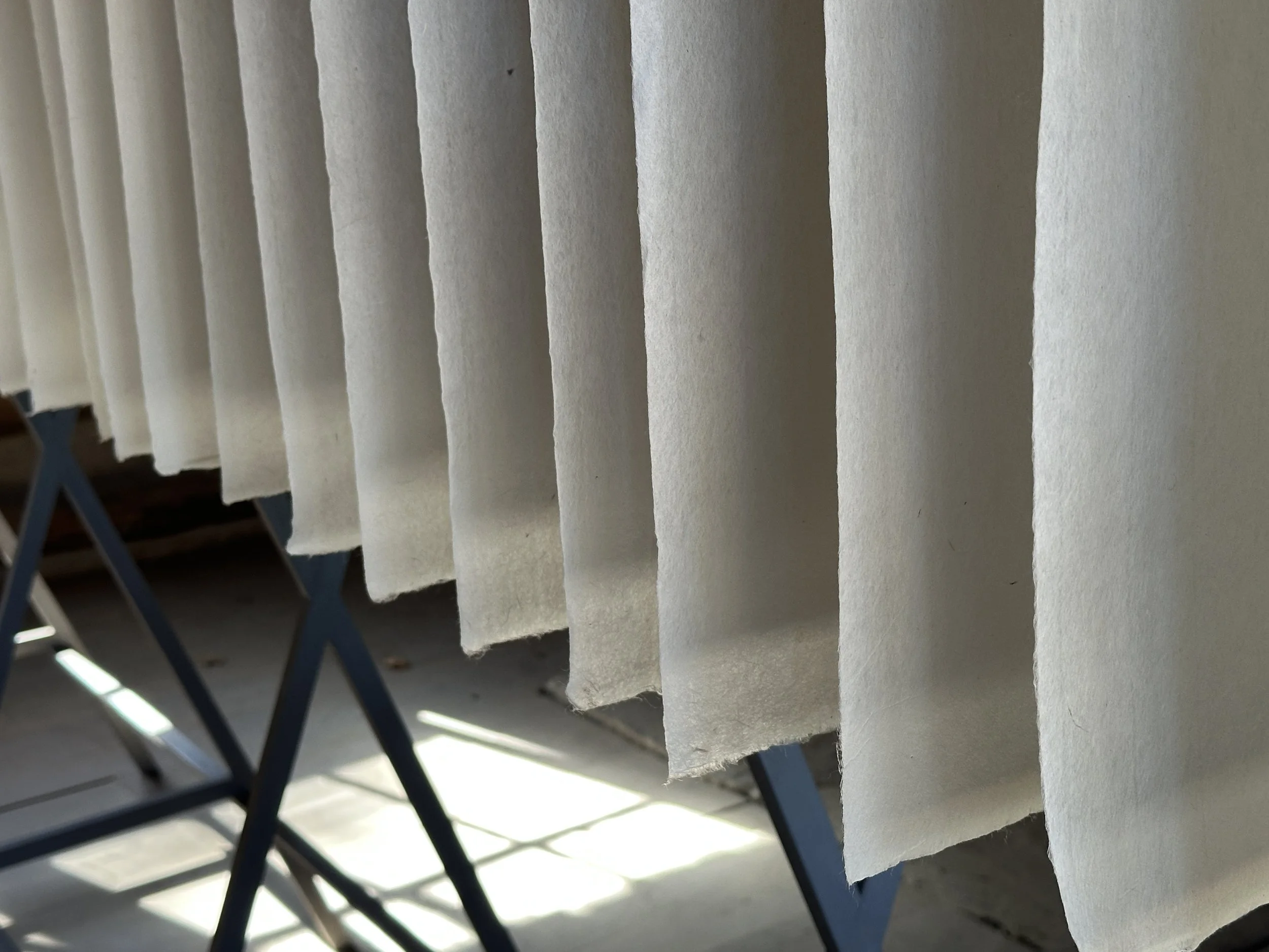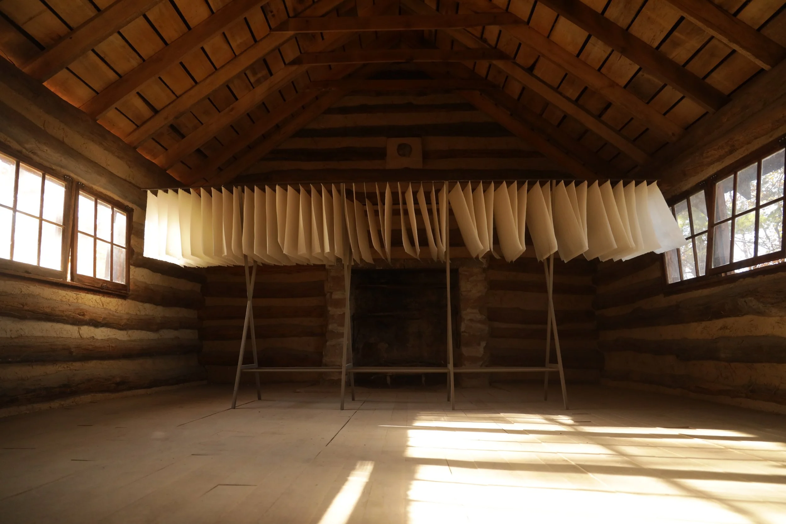 Handmade paper softens and diffuses the light throughout the day, creating shifting beams that trace moments of passage and illuminate different points along the assembled row. In this installation, Hannah and I approached light as a third collaborator—a presence within the space that changes over time, offers information, and seems to hover, linger, or pause. It makes visible the fluid boundary between structure and environment, reminding us that neither space is ever fixed.