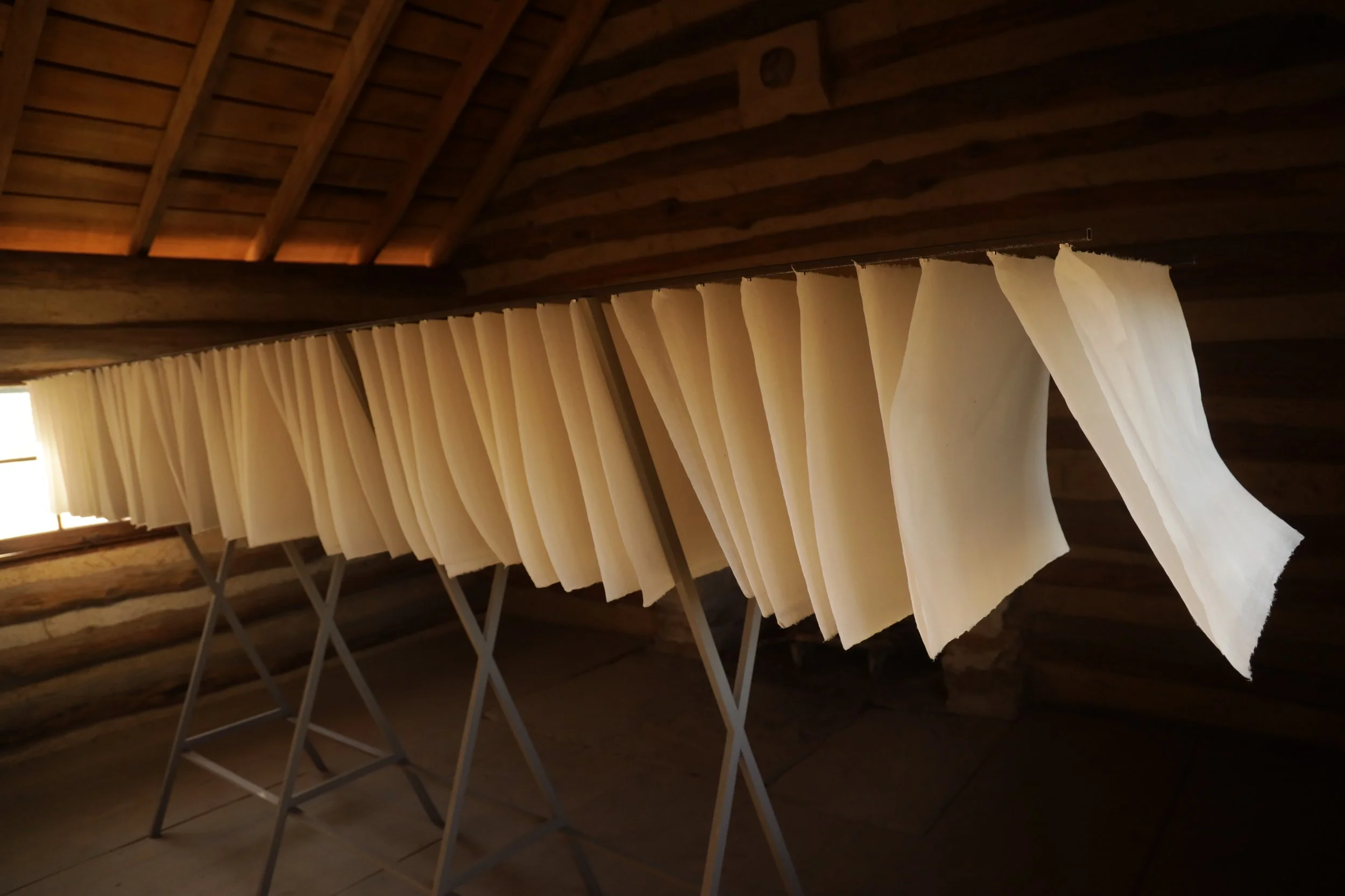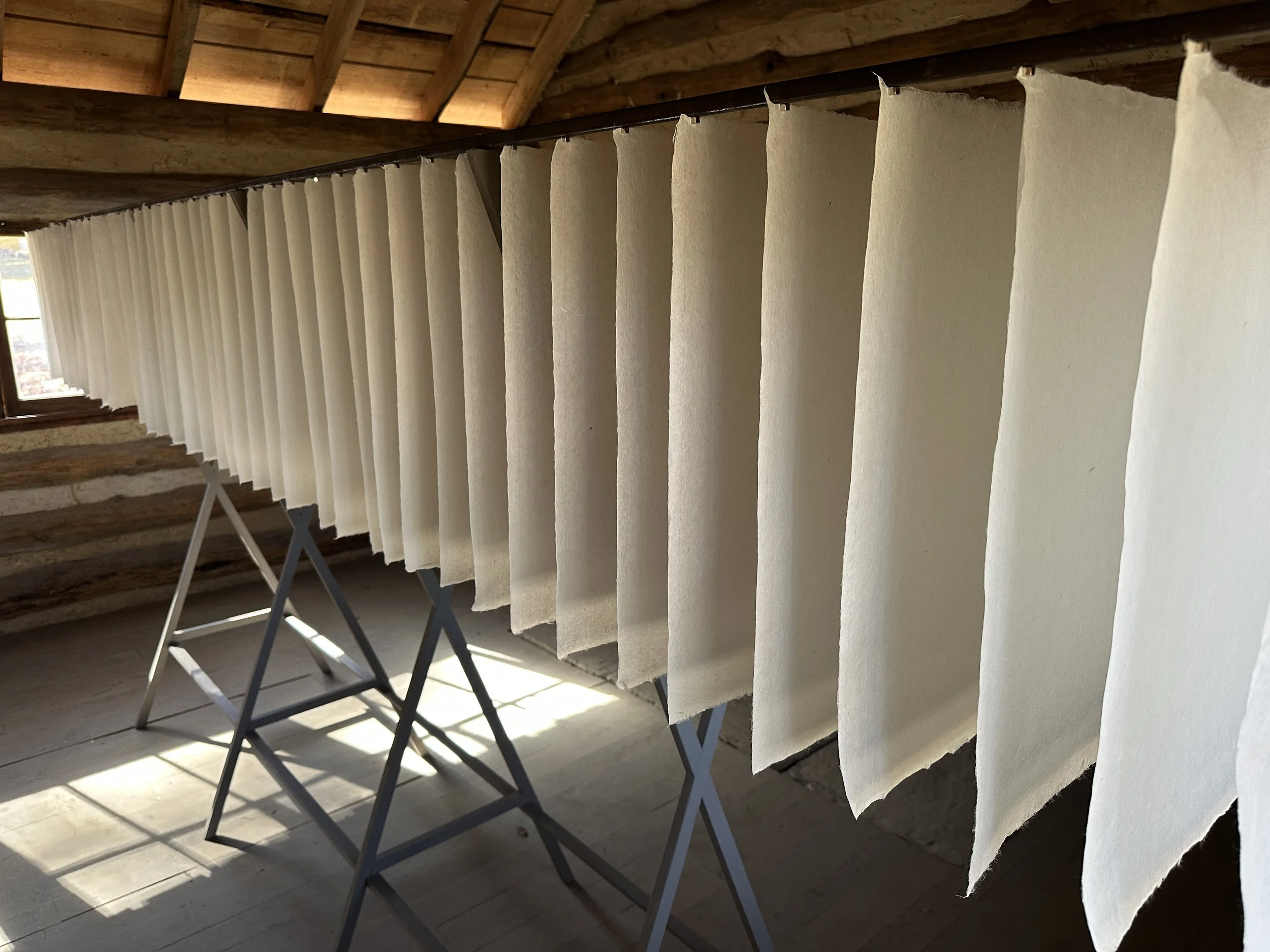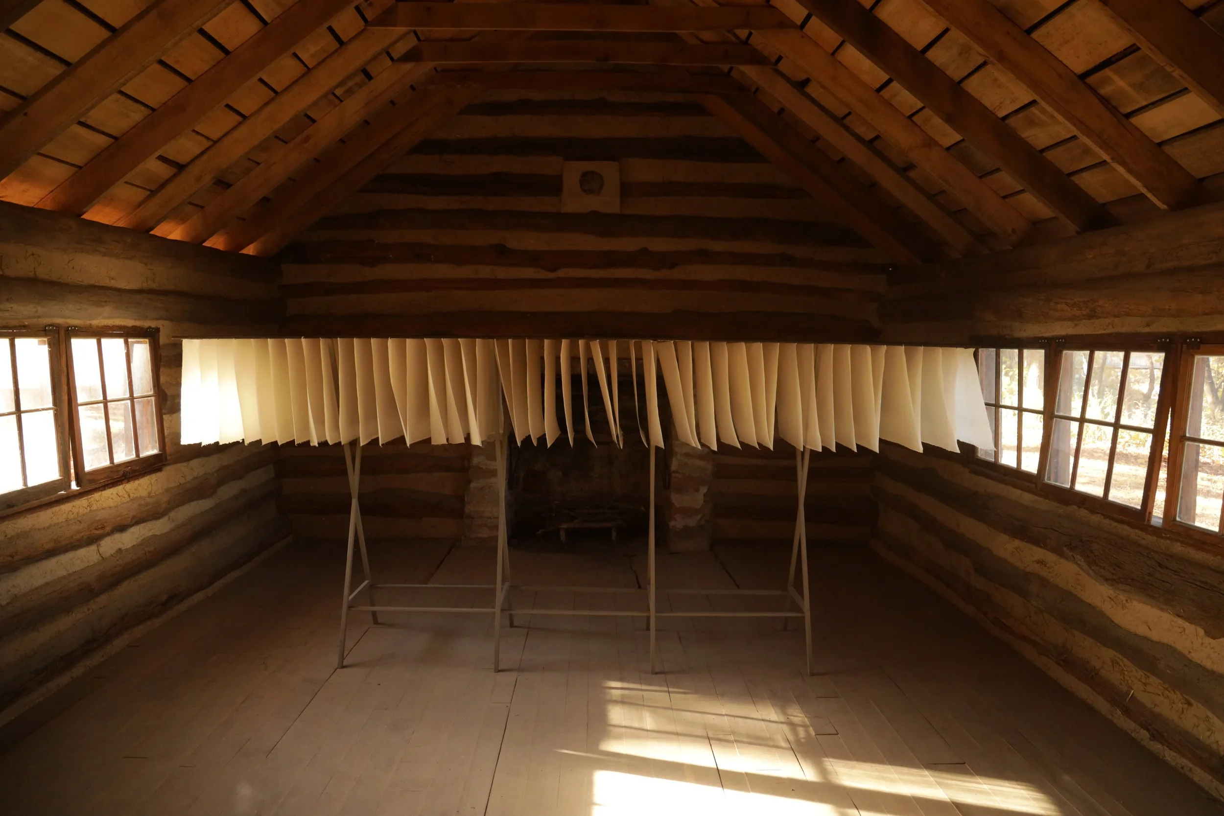 Handmade paper softens and diffuses the light throughout the day, creating shifting beams that trace moments of passage and illuminate different points along the assembled row. In this installation, Hannah and I approached light as a third collaborator—a presence within the space that changes over time, offers information, and seems to hover, linger, or pause. It makes visible the fluid boundary between structure and environment, reminding us that neither space is ever fixed.