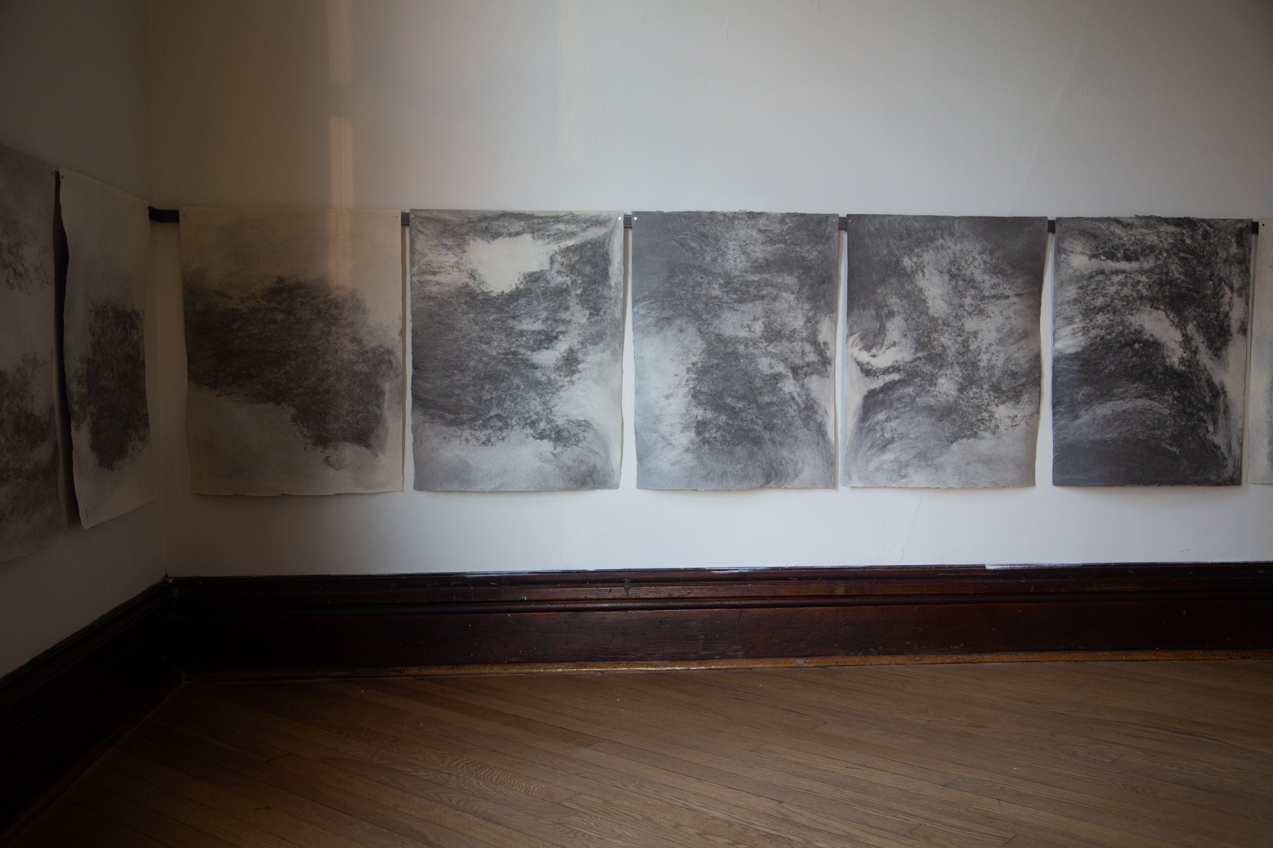 During three separate public paper pull sessions, artist and papermaker Nicholas Cladis invited participants to Public Space One in Iowa City, where each person made a single sheet of paper. These sheets of paper were placed on the walls of PS1's Northside gallery space in the order in which they were made, generating a site-specific, contemplative installation. For each sheet of paper, Cladis added soot-dyed pulp to the slurry little by little, thereby creating a progression in the gallery space: cream-colored paper transitioning to increasingly smoke-like grays and blacks, a reference to Thich Nhat Hanh's mention of burning paper in his sermon, The Universe in a Sheet of Paper.